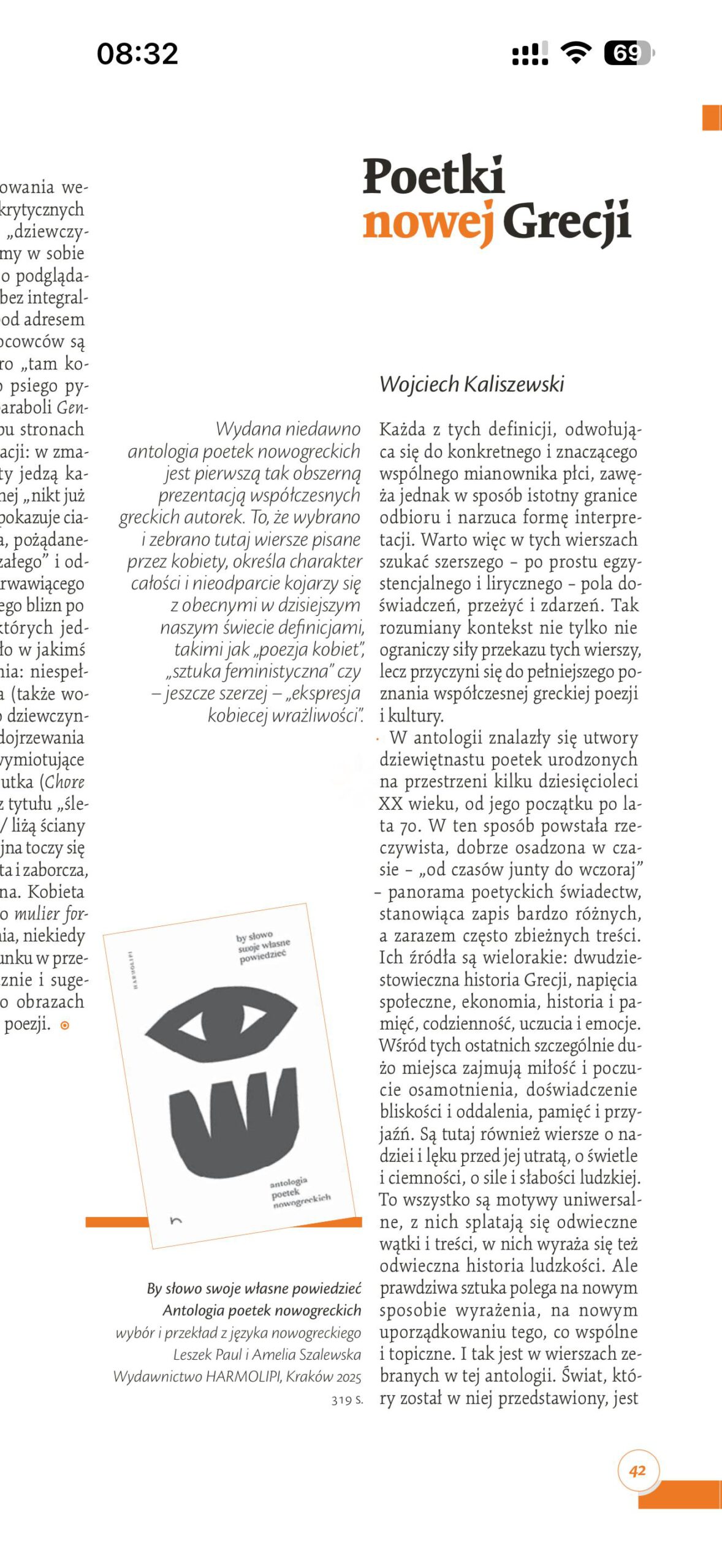 „by słowo swoje własne powiedzieć” – antologia poetek nowogreckich – to przełomowe wydawnictwo – pierwsza w Polsce antologia poezji kobiecej z Grecji oraz pierwsze polskie przekłady twórczości najwybitniejszych nowogreckich poetek. Publikacja ukazuje różnorodność, siłę i oryginalność kobiecego głosu w poezji greckiej XX i XXI wieku.